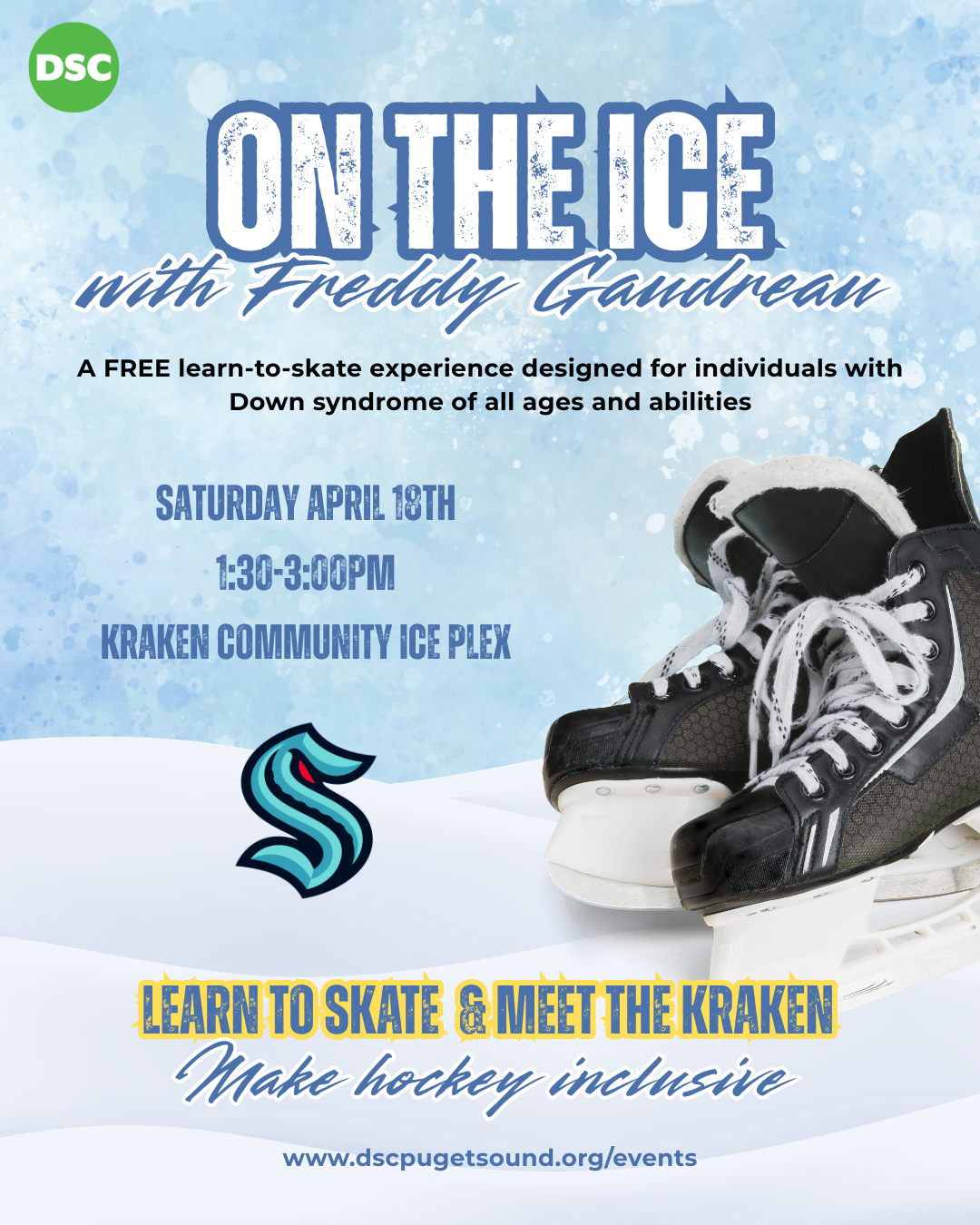 Join DSC for Time on the Ice, a FREE learn-to-skate experience designed to support and welcome individuals with Down syndrome of all ages and abilities. Freddy and friends will be on the ice to encourage skaters, share high-fives, and make the rink a place where everyone belongs.
